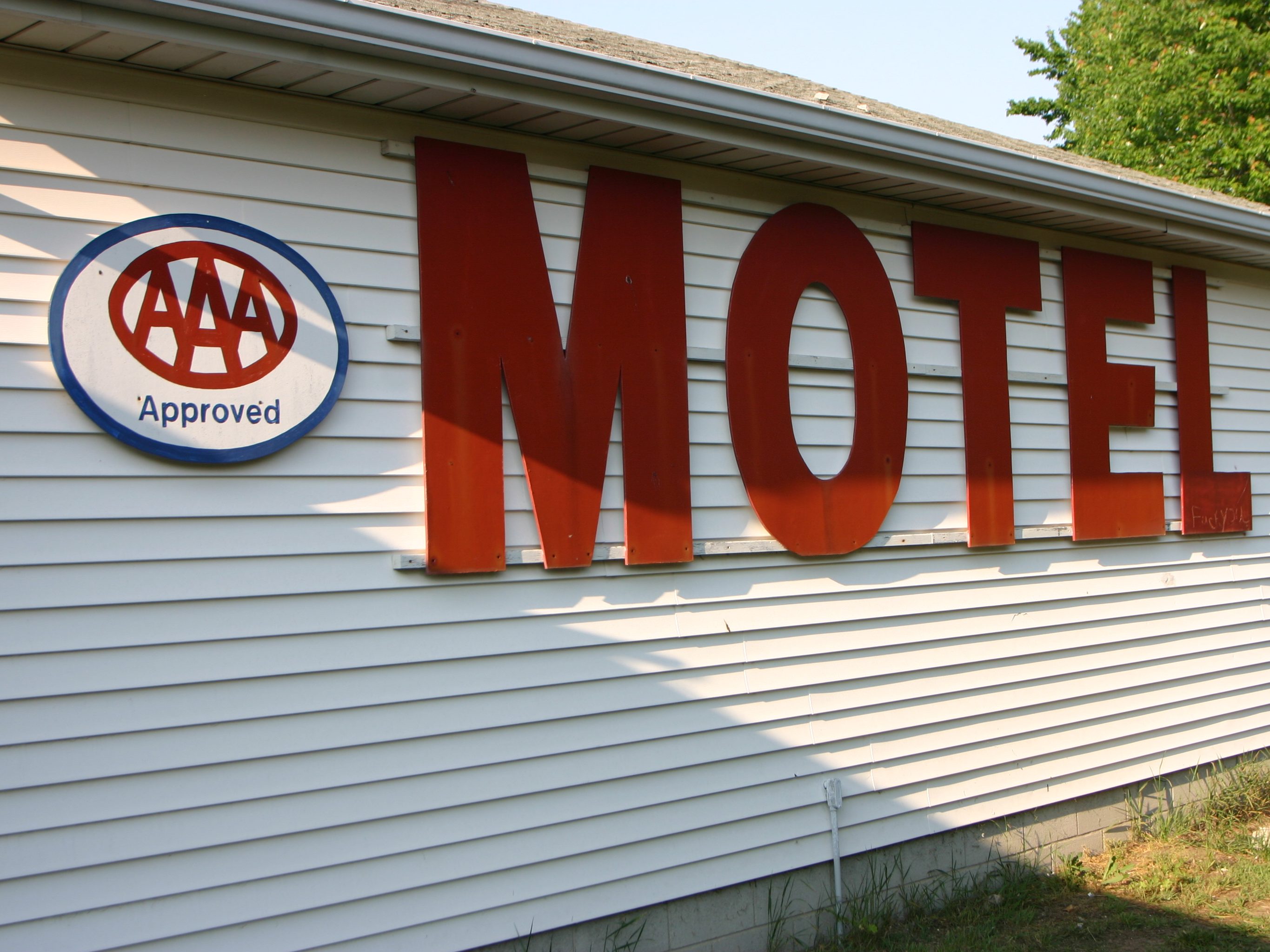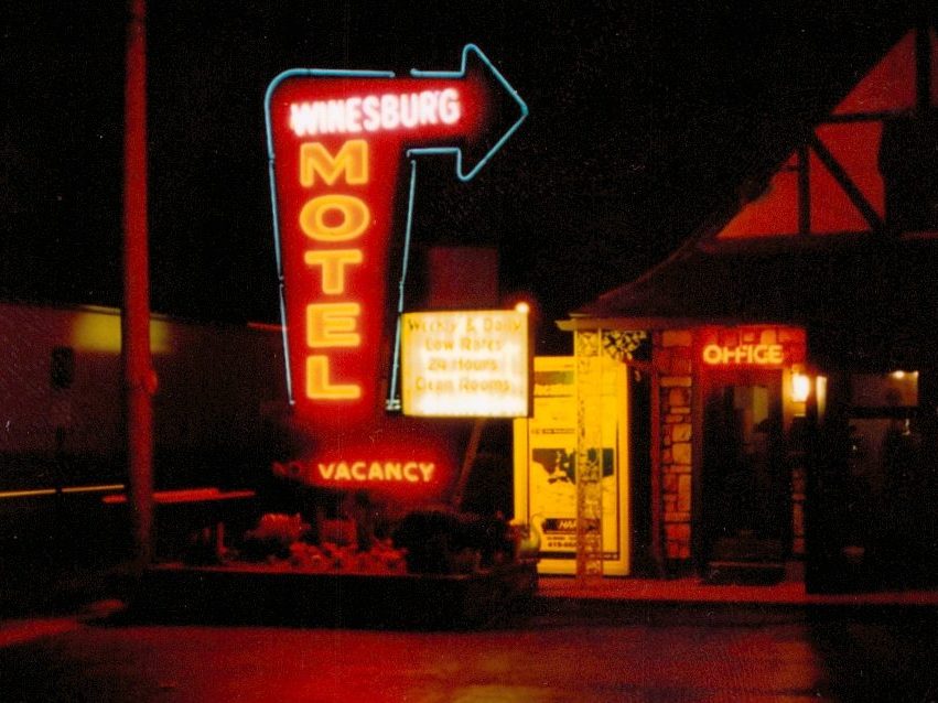 It’s July, 2001, and my road trip partner Kyle and I check into a motel. Our 2001 edition of Road Trip U. S. A. suggests the Winesburg Motel. The book recommends it; I don’t. Our first genuine dive comes with gold paneling and pink sheer polyester curtains matching…